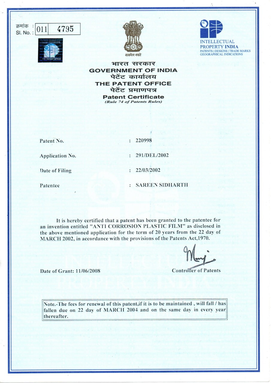 Patent of cross laminated film with reinforcements. Date : 11/06/2021 MUMBAI, INDIA